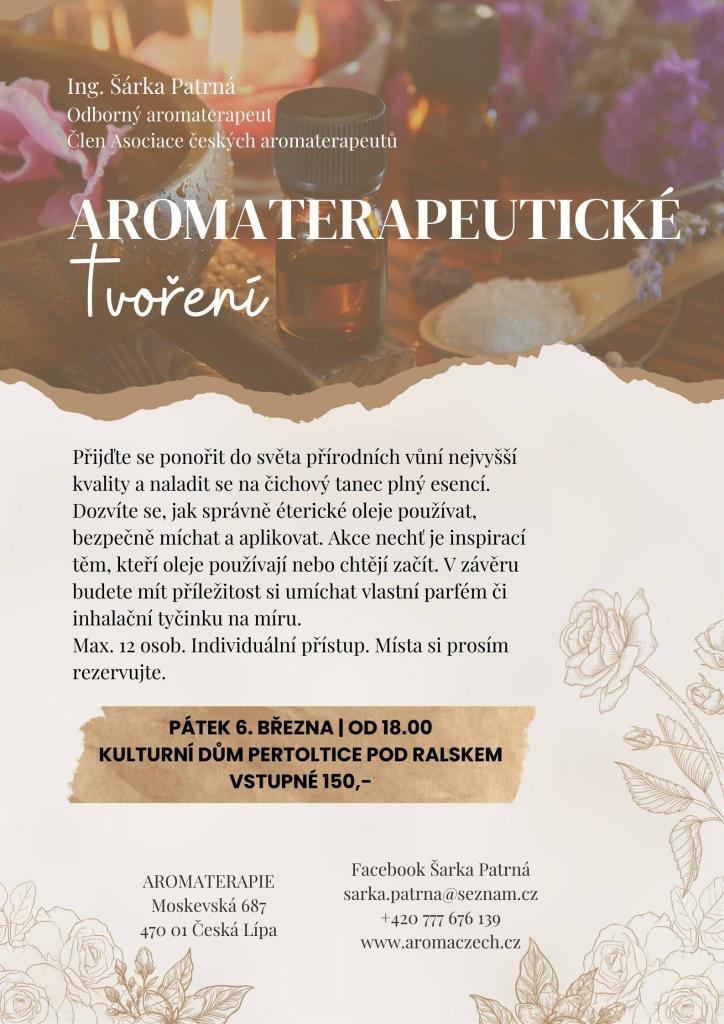 Zveme vás na akci zaměřenou na aromaterapii, která se uskuteční v pátek 6. března od 18:00 v Domě Pertoltice pod Ralskem. Tato událost je určena pro maximálně 12 osob a nabízí individuální přístup. Účastníci se naučí, jak správně používat éterické oleje, bezpečně je míchat a aplikovat. Na závěr si každý bude moci vytvořit vlastní parfém nebo inhalační tyčinku na míru.