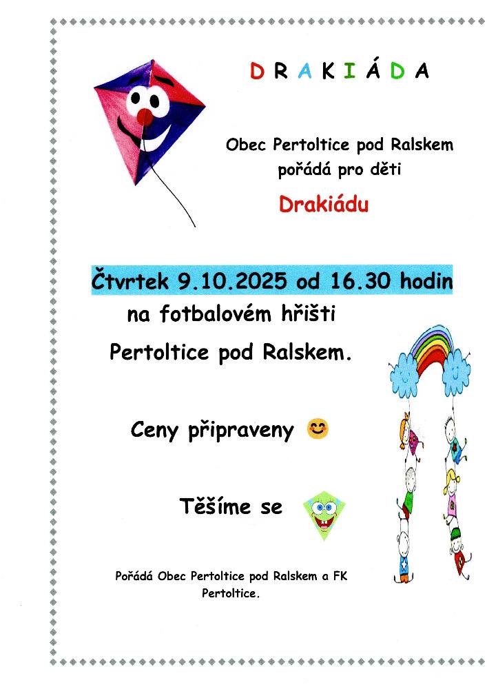 Srdečně zveme všechny děti na Drakiádu, kterou pořádá obec Pertoltice pod Ralskem spolu s FK Pertoltice. Akce se uskuteční na fotbalovém hřišti, kde si děti užijí zábavu s pouštěním draků. Připravili jsme pro vás také skvělé ceny, takže neváhejte a přijďte si užít hezký den!