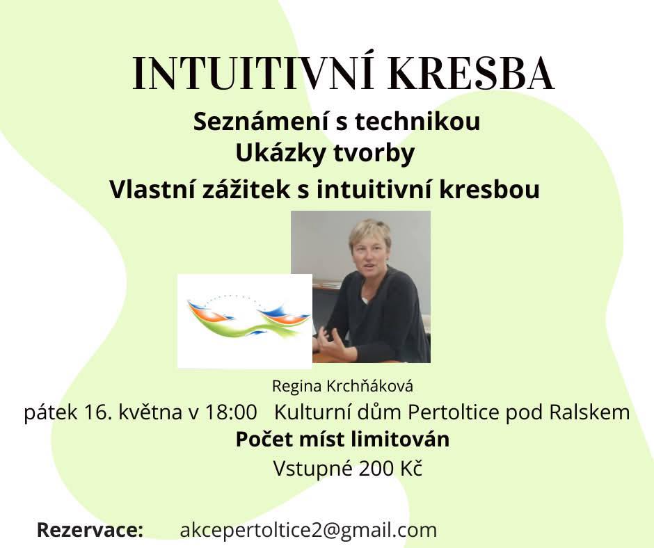 Zveme vás na workshop intuitivní kresby, který se koná v pátek 16. května v 18:00 v Kulturním domě Pertoltice pod Ralskem. Během akce se seznámíte s technikou kresby, uvidíte ukázky tvorby a zažijete vlastní kreativní zážitek pod vedením Reginy Krchňákové. Počet míst je limitován, proto neváhejte a rezervujte si své místo.
