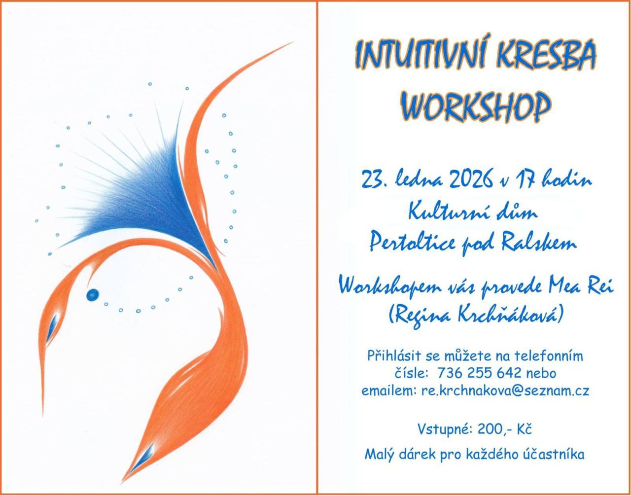 Zveme vás na workshop zaměřený na intuitivní kresbu, který se uskuteční 22. března 2026 v kulturním domě. Tento workshop povede zkušená lektorka Regina Krchňáková, která vám poskytne užitečné tipy a inspiraci pro vaši kreativitu. Na účastníky čeká také malý dárek jako poděkování za účast. Nezapomeňte se přihlásit předem, abyste si zajistili místo.
