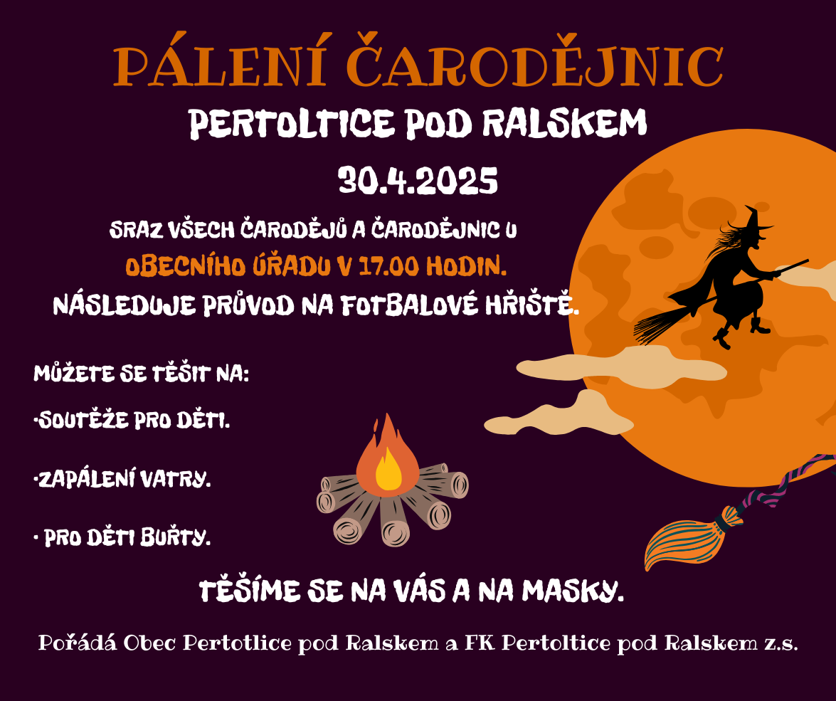 sraz všech čarodějů a čarodějnic u obecního úřadu Pertoltice pod Ralskem v 17.00 hodin a následuje průvod na fotbalové hřiště.