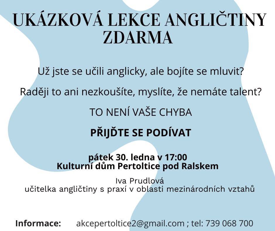 Zveme vás na ukázkovou lekci angličtiny, která se koná v pátek 30. ledna v 17:00 v Kulturním domě Pertoltice pod Ralskem. Tato akce je určena pro všechny, kteří se chtějí zbavit strachu z mluvení anglicky a zlepšit své jazykové dovednosti. Učitelka Iva Prudlová má zkušenosti v oblasti mezinárodních vztahů a ráda vám pomůže na vaší cestě k plynulosti. Vstup je zdarma, neváhejte a přijďte se podívat!